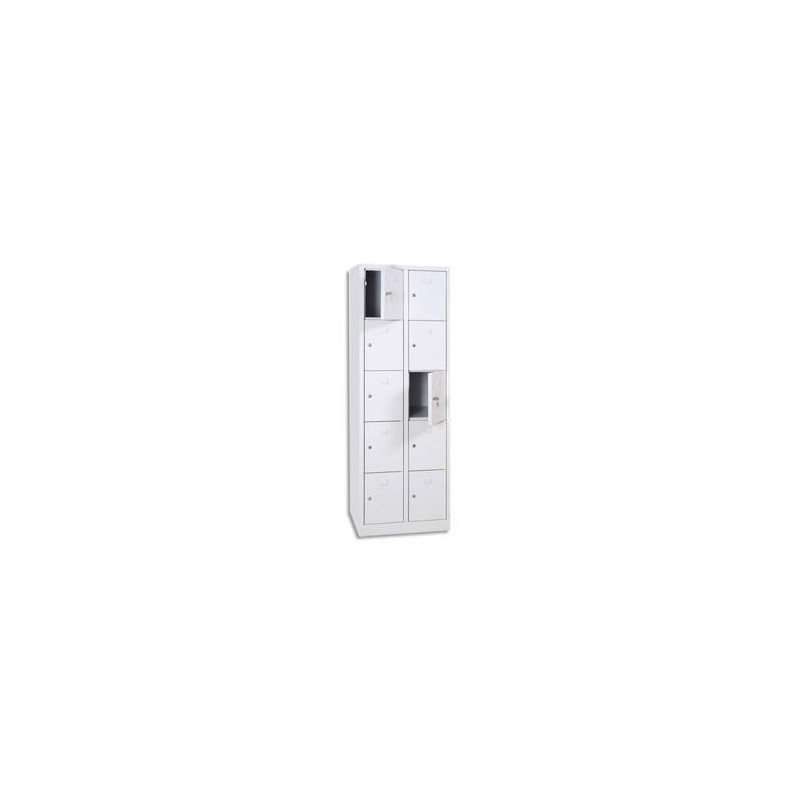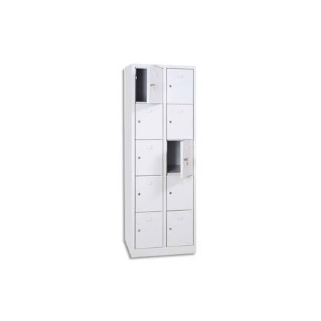 Construction monobloc soudée en tôle d’acier épaisseur 0.8 mm. Socle fond plat. Perforations en façade pour aération. Portes en métal avec porte étiquette. Fermeture par moraillon. Porte indégondable lorsqu’elle est fermée. Coloris Blanc. 2 versions : 4 cases et 5 cases.