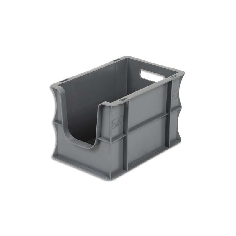 Accès facile du fait de leur large ouverture. Bacs de rangement à ouverture sur la largeur ou la longueur. En polypropylène gris. Gerbables. Norme Européenne.