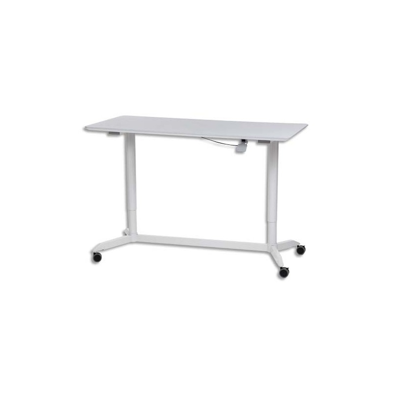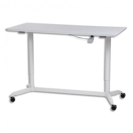 Bureau réglable en hauteur plateau en MDF aile d’avion piètement en acier avec vérins pour une bonne stabilité. Le réglage en hauteur se fait par vérin pneumatique grâce à la manette située sous le plateau. Hauteur variable de 71 à 117 cm. Fourni avec des roulettes pour le transformer en bureau mobile. Largeur 140 cm profondeur 70 cm.