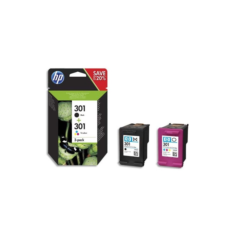 HP 301 Pack de 2 Cartouches d'Encre Noire et Trois Couleurs Authentiques (N9J72AE)
