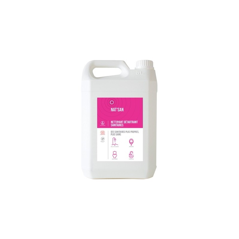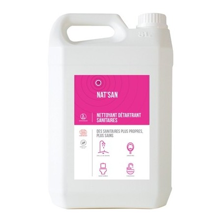 Il redonne aux installations leur éclat naturel. Pour des sanitaires plus sains, NATSAN, est bactéricide selon les normes EN 1276 en condition de saleté (5 min), EN 13697 en condition de propreté (10 min) et levuricide selon la norme EN 1275 (15 min).