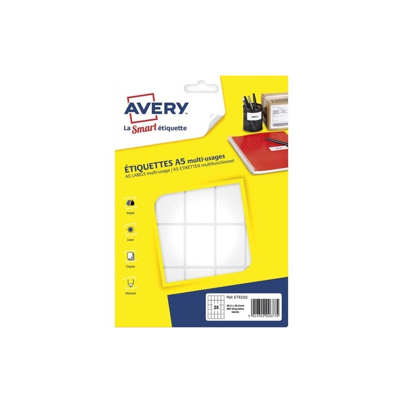 AVERY Sachet de 400 étiquettes multi-usage Blanches 38,5 x 26,5 mm. Planche format A5. ETE025